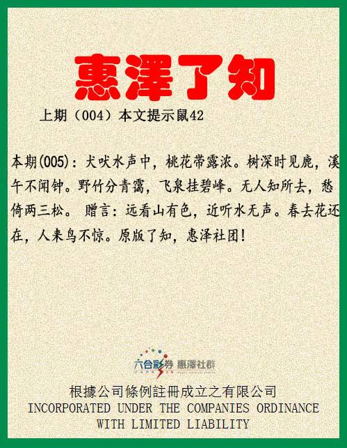 【惠泽了知】005期:本期(005):犬吠水声中,桃花带露浓。树深时见鹿,溪午不闻钟。野竹分青霭,飞泉挂碧峰。无人知所去,愁倚两三松。贈言:远看山有色,近听水无声。春去花还在,人来鸟不惊。原版了知,惠泽社团! 【惠泽六肖】:猴虎马羊龙蛇 【惠泽三肖】:猴虎马 【惠泽一肖】:猴 【惠泽特码】:10.22.16.28.24.36.11.23.14.26.13.25 【惠泽平肖】:蛇蛇蛇 【惠泽平尾】:444 |